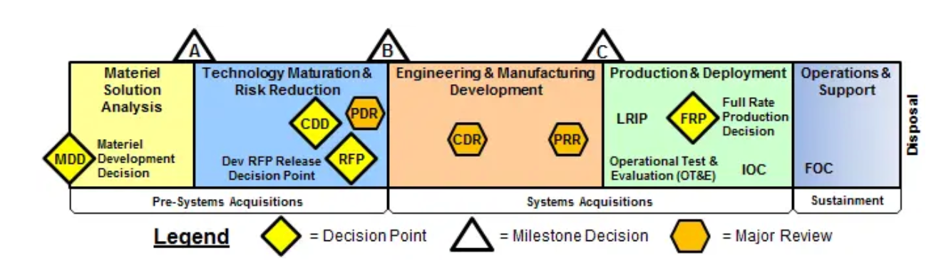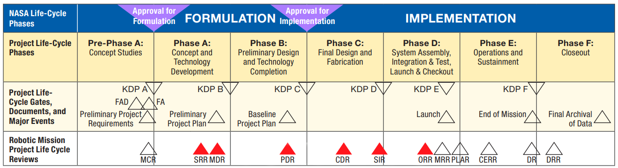 Each of these stages has a major design review “gate” associated with it (see below for NASA and USAF documents mapping these out). You typically aren’t allowed to progress through to the next layer without passing the gated design review approvals from all parties involved, agreeing that the hardware does or will do what’s intended.
