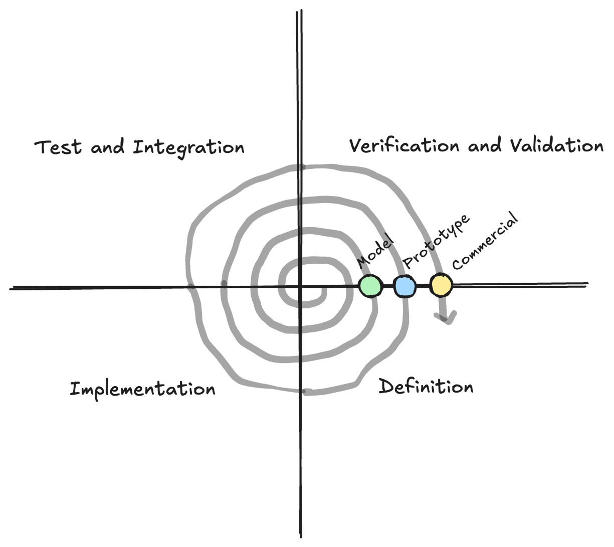 A 2012-era SpaceX presentation is often cited as the basis of most “Agile Hardware Engineering” approaches, which introduced the “Spiral Method. The Spiral Method still acknowledges a Systems Engineering Vee but instead lightly “spirals” through the Vee. Each of the major Vee stages are loosely defined at first pass, and iteratively refined in successive loops over the Vee. SpaceX additionally adopted many of the tactical agile planning tools available at the time to track progression through the Agile Hardware Engineering process.