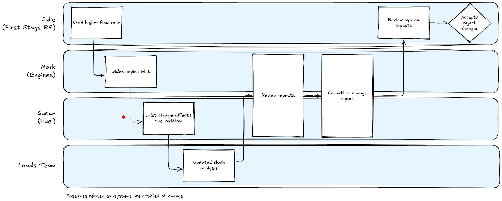 Consider this network diagram of people working together on an engineering platform. Mark might be working on the engine while Susan is working on the fuel tank. The engine needs to plug into the fuel tank at some point. However Mark was told (by Julie, the first stage Responsible Engineer) he needs better fluid flow rates to increase engine performance, so he widens the entry point. At some point he has to tell Susan about this, who cares about how much fuel is flowing out of her fuel tank. So they get together, negotiate the change (Susan now needs to work with Loads to model how the fuel sloshes around differently), and build a report on the impacts.