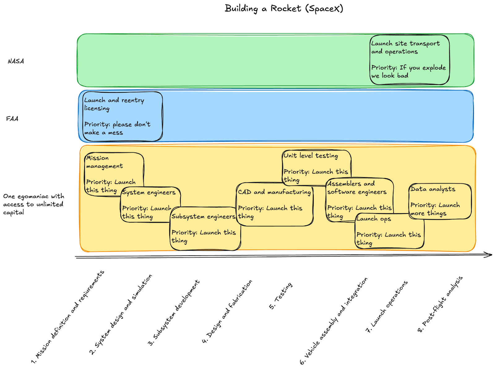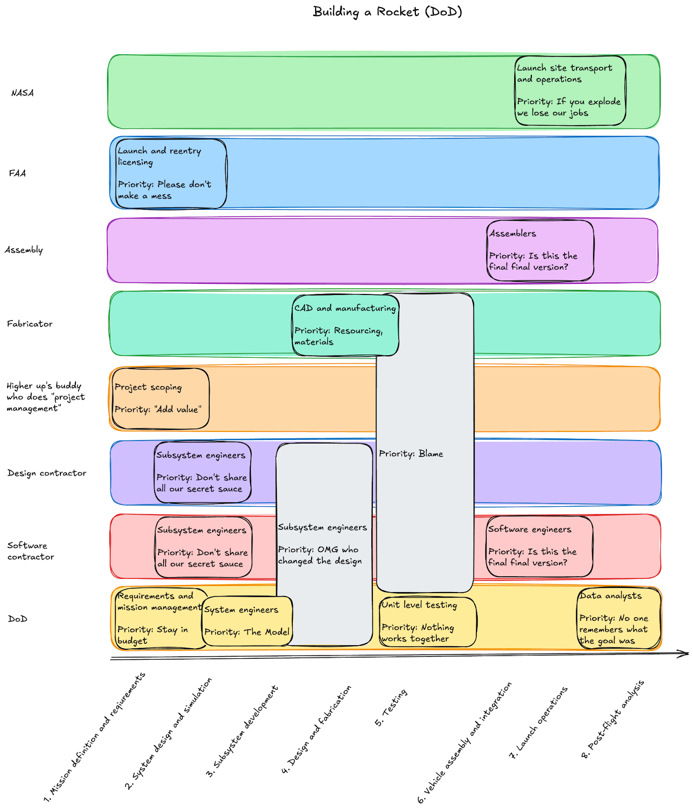 Your tactical Agile paradigm starts to break down at these edges. And these aren’t insignificant edges, these are the explicit use cases seen on every major vehicle and weapon system the DoD buys, on every major automobile, and every medical device. In fact, case 1 contributes heavily to why engineers prefer to make small iterative changes on known-good technical baselines instead of fully exploring novel design spaces (see: 737-MAX8 as an iteration of the 737 family). Recall that the only reason SpaceX started to vertically integrate in the mid-late-aughts is because their vendors could not move fast enough. They didn’t start the company expecting to make everything in-house!