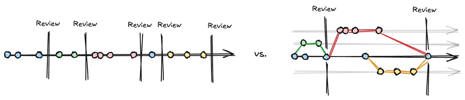These frequent checks allow teams to incorporate new information and quickly pivot when required. Furthermore, the revision control processes allow teams to iterate on decisions that may or may not make it into the end product, as they can always choose to not merge a branch.